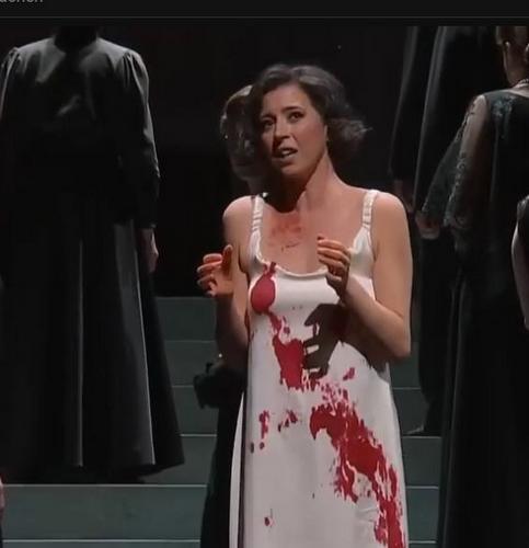 Mord und Totschlag bewirken dann einen massiven musikalischen Szenenwechsel. Klanglich tun sich tiefe Krater auf, Komponist Riede ist nach spätromantischer Idylle in der klassischen Moderne angekommen, das Orchester auf expressivem, hochdramatischem Kurs. Und Königin Maria wird zur Furie, ihren Sopran in höchster Lage strapazierend und einen zu Herzen gehenden Abgesang auf ihre große Liebe anstimmend. Während die Wachen Pere Pou Llompart, André Lopes, Isaac Tolley und David Hong einen dunkel dräuenden Extrachor abgeben und auf den Leinwänden wieder Unwetter einsetzt.