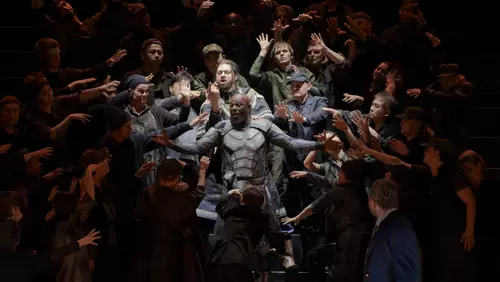 Die Hinweise sind also zahlreich und komplex, oft eher politisch und symbolisch als auf die Geschichte der Charaktere bezogen. Die sorgfältig orchestrierte und präzise Regie sorgt für eine gute Organisation der Massen, während die Solopartien etwas generisch bleiben. Im Großen und Ganzen gibt es einige sehr gute Momente, aber auf Dauer ist die Menschenmasse vielleicht zu viel, was zu einem ‚Zeffirelli‘-ähnlichen Effekt führt, bei dem man Mühe hat, den Sängern zu folgen, die sich in einer übermäßigen Masse von Menschen verlieren. Auch wenn die Chöre sehr wirkungsvoll sind, die Kulisse, eine einzige für fast vier Stunden Aufführung, zeigt trotz ihrer Beeindruckung einige Grenzen auf.