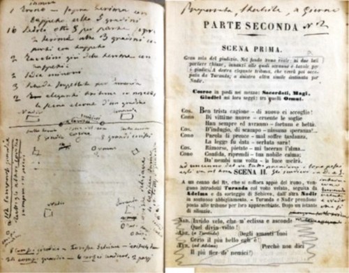 Pagina dal ritrovato libretto di Turanda, con le annotazioni manoscritte sceniche e di regia della prima rappresentazione al Teatro alla Scala del 1867. (Milano, Biblioteca del Conservatorio)