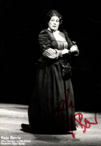 Ihre Stimme ist in Gesamtaufnahmen von Der fliegende Holländer (als Mary), Notre Dame von Franz Schmidt (als Die Alte Falourdel), Flammen von Erwin Schulhoff und Der Corregidor von Hugo Wolf zu hören. Kaja Borris starb im Oktober 2025 im Alter von 86 Jahren in ihrer Wahlheimat Berlin (Foto oben: Kaja Borris als Mrs. Quickly/Falstaff/Foto DOB/Kranich/Widmung privat). Wikipedia